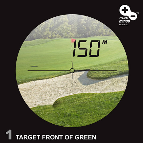 On a typical approach shot, use the EASY 800 to quickly and accurately measure the distance to the front of the green. This is the Target and the measured Target distance stays in the EASY 800 memory. In this example a reading of 150 metres to the Target is taken. Now other relative distance information can be gathered from the hole.
